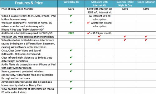 Top Reviews from Engadget, TUAW, Time Out Kids, Kolcraft, AppleTell and other tech and parenting websites! Watch & Hear your baby at home or anywhere on iPhone, iPad, Android, Mac or PC! Traditional Video Baby Monitors: Use open analog radio signals subject to static, picture quality, distance and privacy issues. WiFi Baby 3GTM: Uses home WiFi network to stream interference-free, password-protected video & audio to iPhone, iPad, Android, Mac or PC at home or anywhere. What makes a WiFi Baby ...As of Tuesday, April 10, 2012 6:02 PM PST ( *Pricing disclaimer : Product prices, promotion and availability are accurate as of the date/time indicated and are subject to change without notice. Any price and availability information displayed on the original websites, as applicable at the time of purchase will apply to the purchase of related products. )